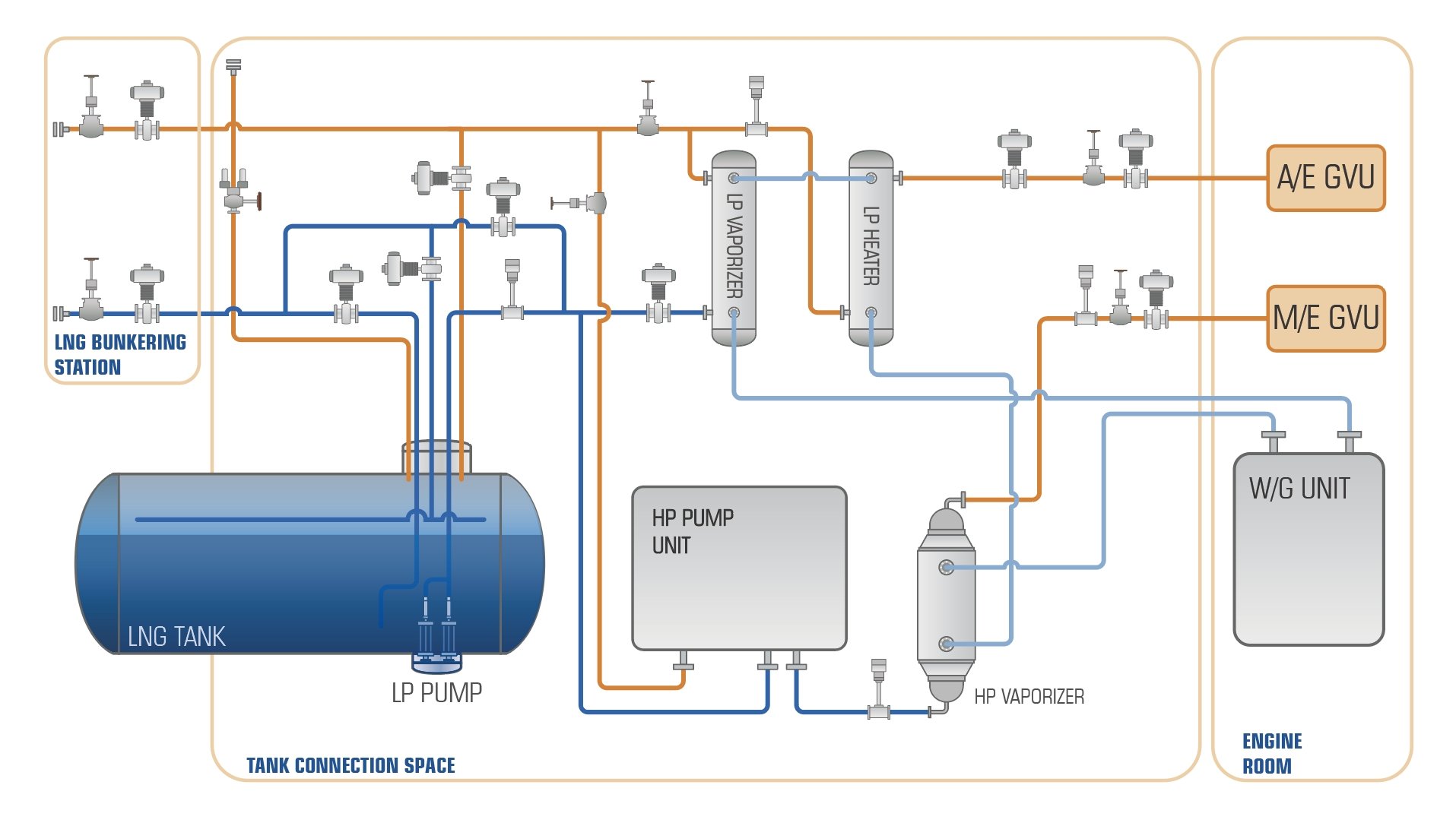 整個(gè)氣體工藝包采用定制化開發(fā)/模塊化設(shè)計(jì),可根據(jù)船舶布置實(shí)現(xiàn)布局的最優(yōu)化。天然氣經(jīng)中間介質(zhì)加熱,降低天然氣與熱源之間的交叉泄漏風(fēng)險(xiǎn),同時(shí)確保在不同航區(qū)不同環(huán)境條件下供氣系統(tǒng)和加熱單元的靈活性和穩(wěn)定性。